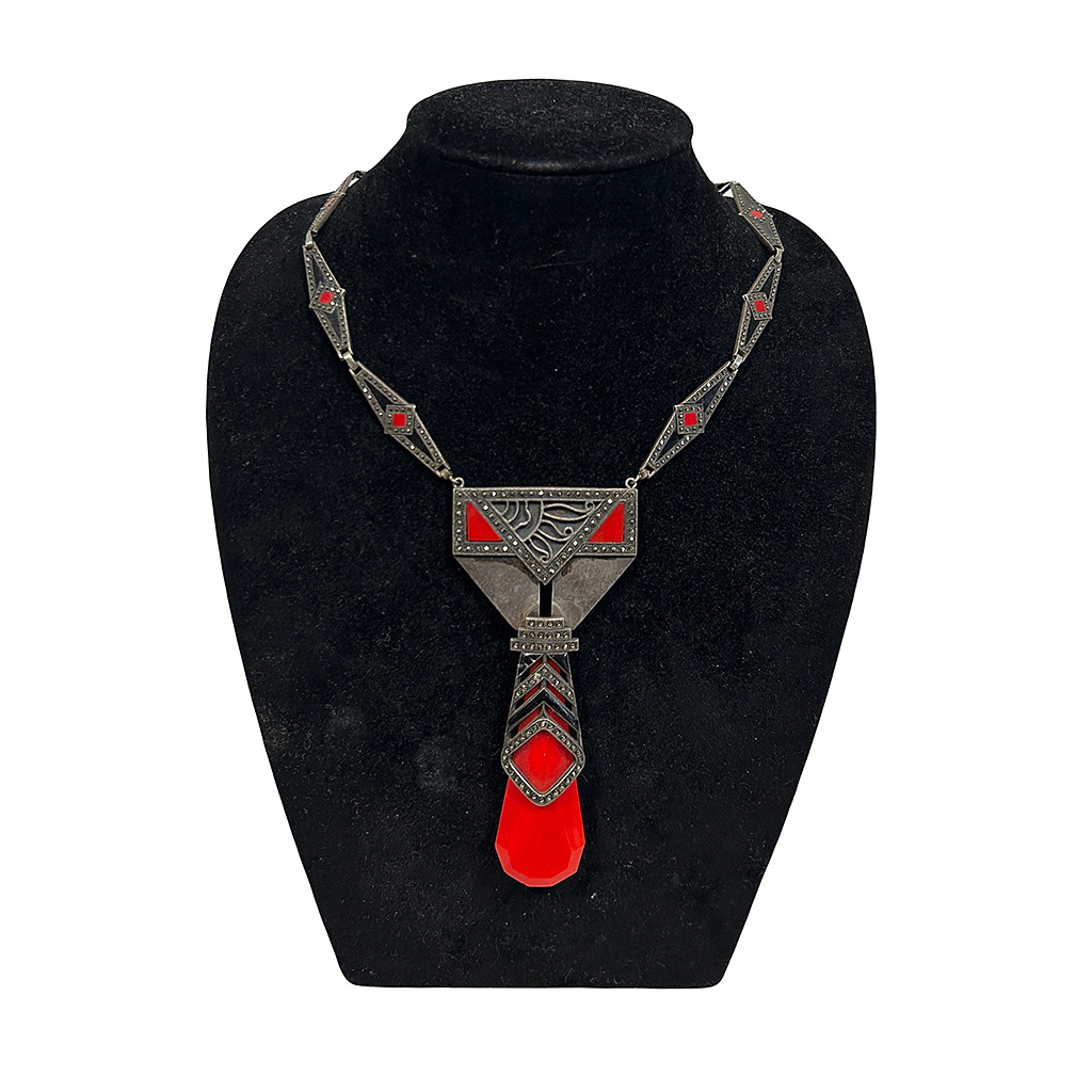 ART DECO SILVER AND MARCASITE NECKLACE WITH RED BAKELITE DROP AND BLACK AND RED BAKELITE LINKS