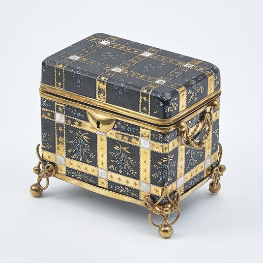 DECORATED BLACK AND DARK AMETHYST GLASS BOX WITH GILT BRONZE MOUNTS ATTRIBUTED TO MOSER BOHEMIA CIRCA 1860 13 CM HIGH 15 CM WIDE 9 CM DEEP
