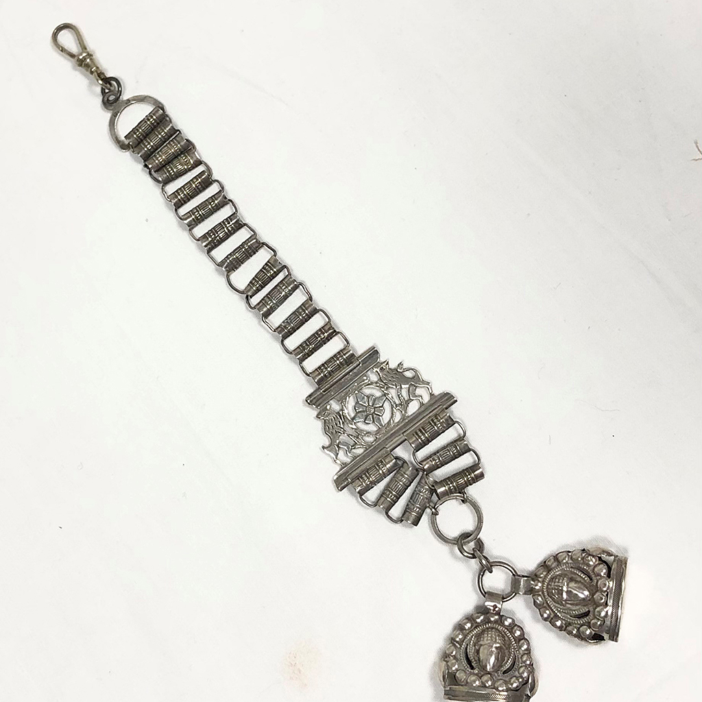 DECORATIVE SILVER WATCH CHAIN WITH TWO HANGING SEAL STAMPS
