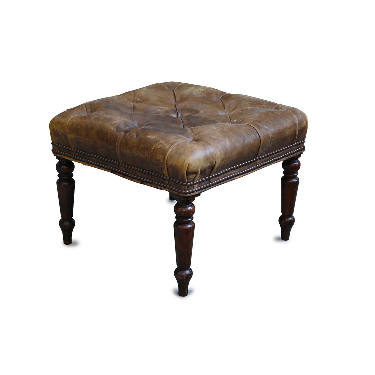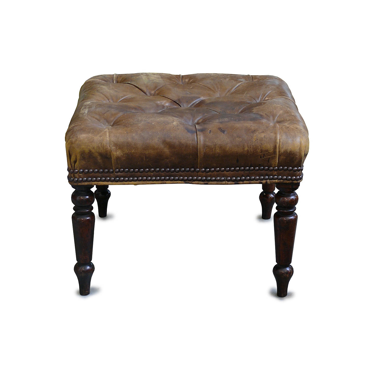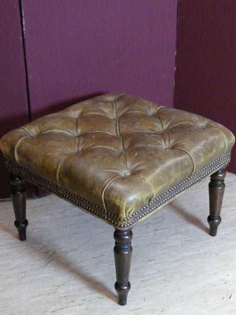 DEEP BUTTONED ANTIQUE GREEN LEATHER STOOL WITH TURNED LEGS