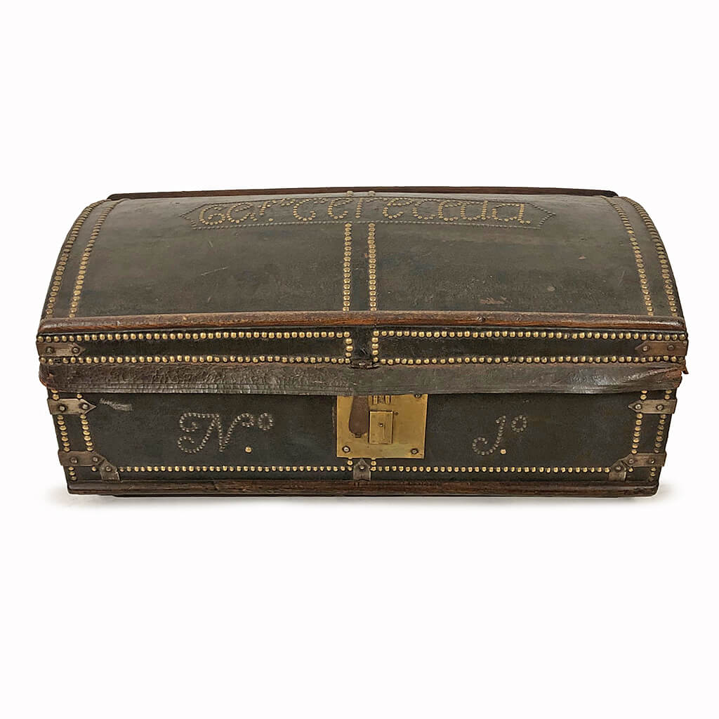 DOMED TOP TRAVELLING TRUNK BLACK LEATHER WITH BRASS STUDS / NAILS FRENCH CIRCA 1760 41 CM HIGH 93 CM LONG 47 CM WIDE