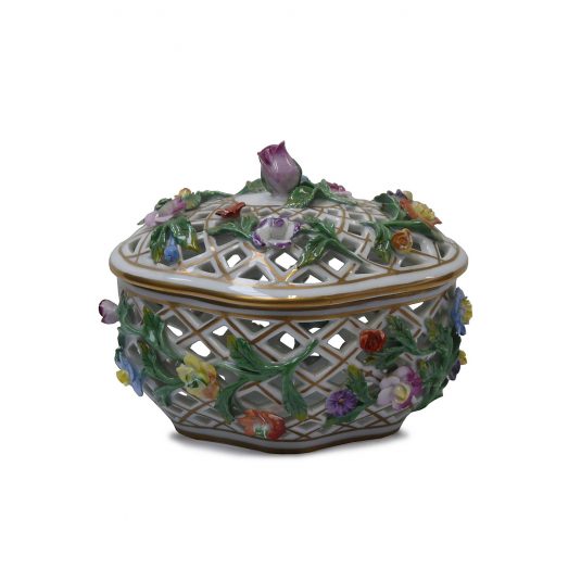 DRESDEN OVAL SHAPED PIERCED FLORAL COVERED BOX 13 CM HIGH