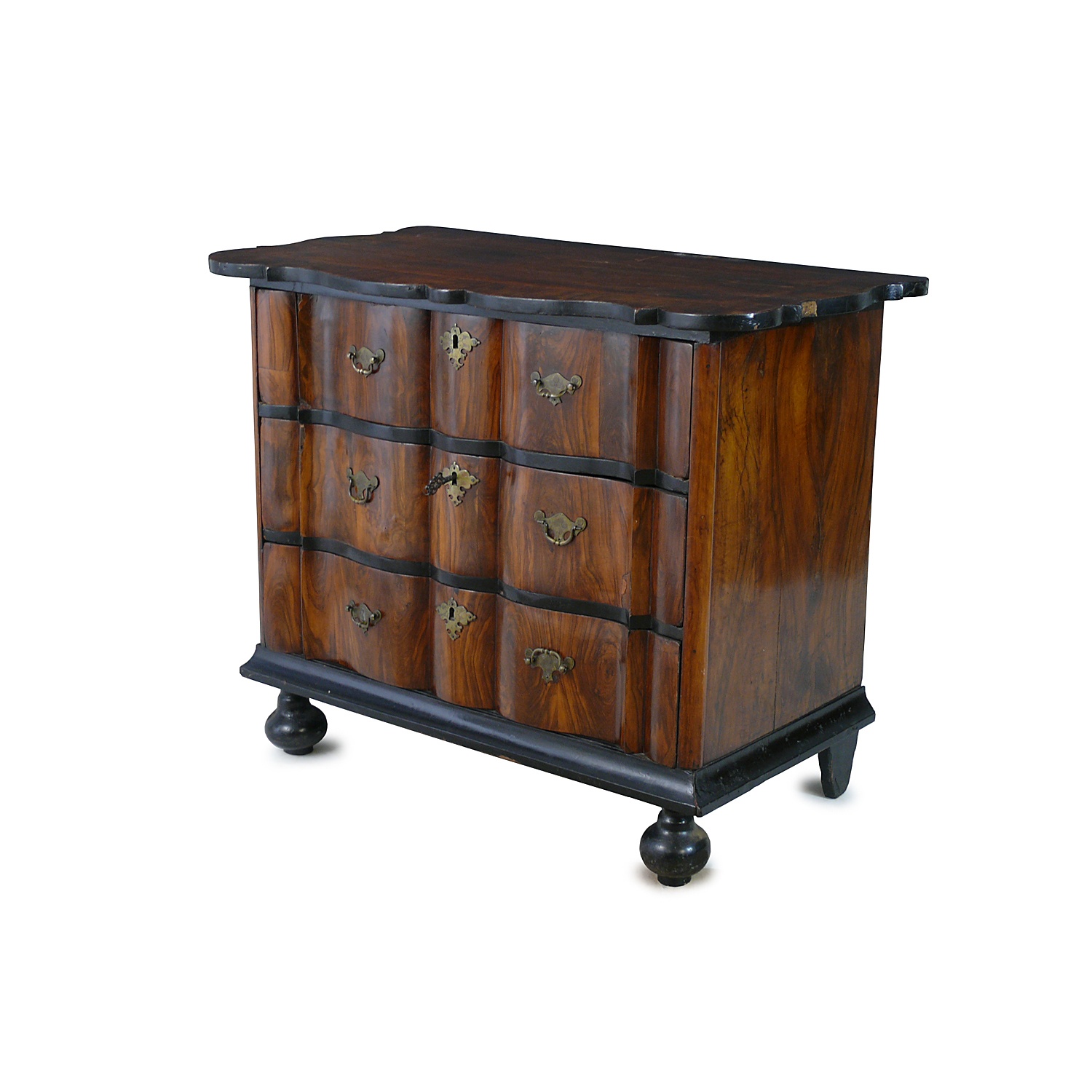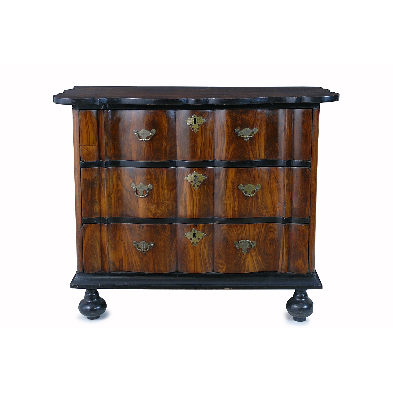 DUTCH COLONIAL CHEST OF DRAWERS WITH SERPENTINE FRONT WALNUT ON EBONY BUN FEET LATE 18TH CENT 76 CM HIGH