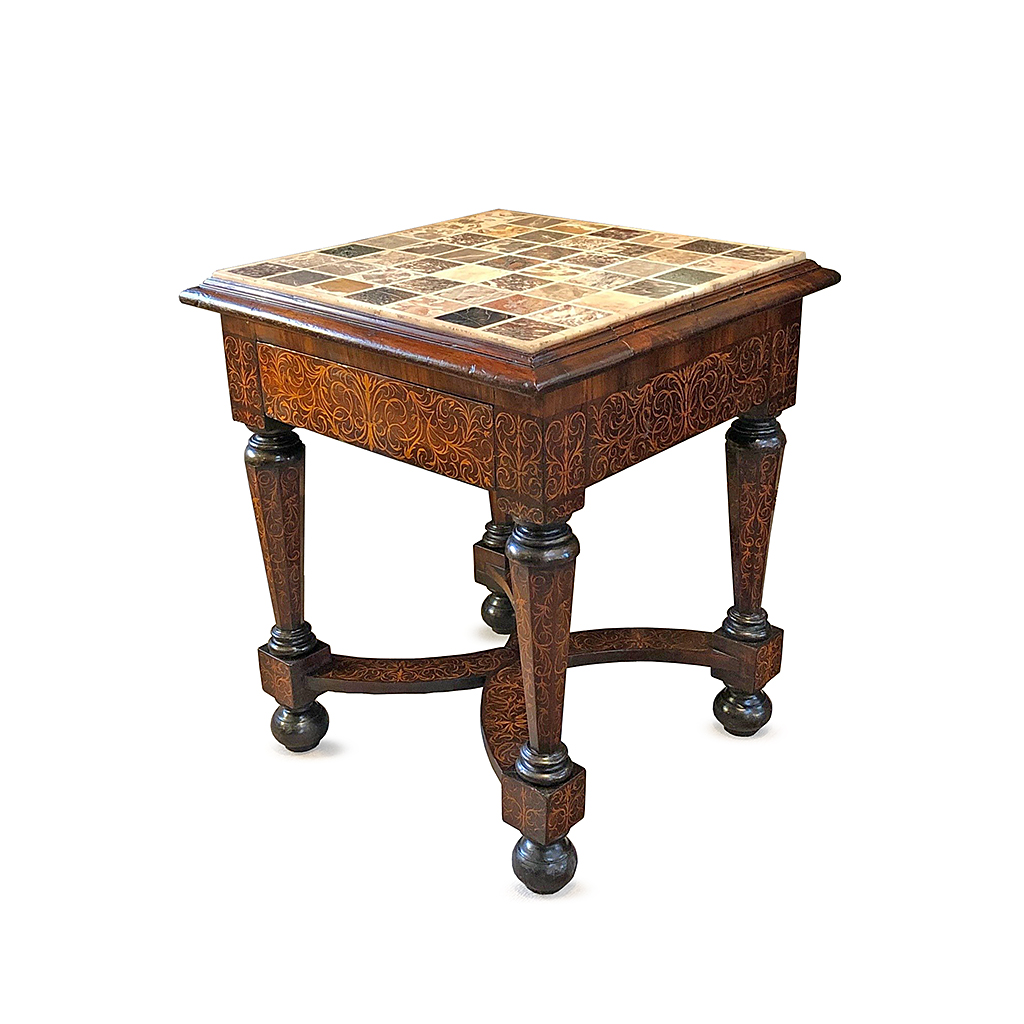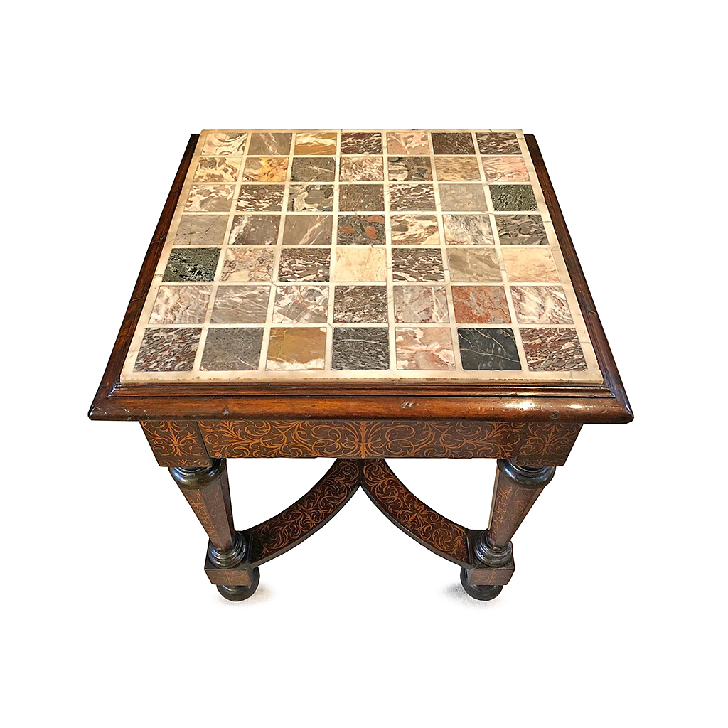 DUTCH SEAWEED MARQUETRY TABLE WITH SPECIMEN CHEQUERED MARBLE TOP AND SINGLE DRAWER 18TH CENT. 81 CM HIGH 68 CM DEEP 69 CM WIDE