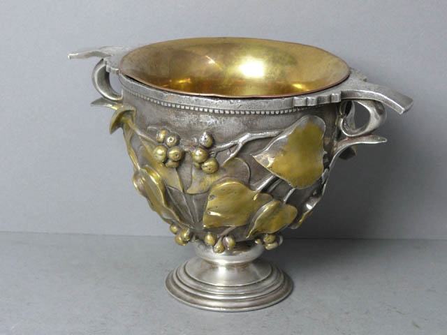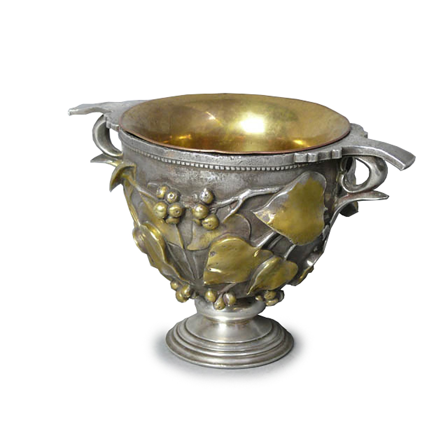 E.P. GILT CLAUDIUS ROMAN CUP WITH VINE AND LEAF DECORATION AND TWIN HADLES 16 CM HIGH