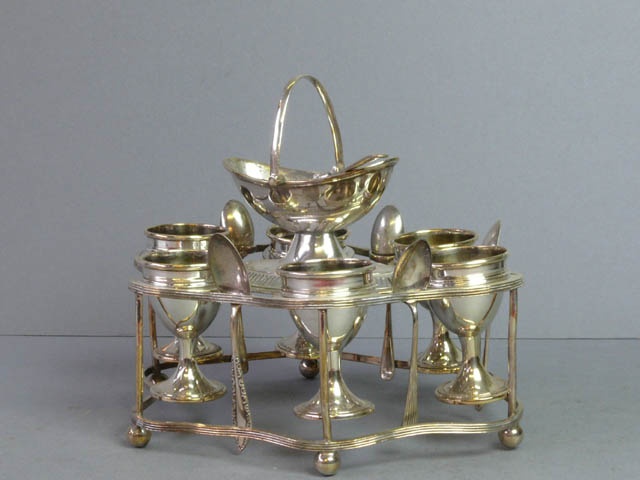 E.P. SILVER BOILED EGG STAND INC. SIX CUPS SIX SPOONS AND SALT URN 23 CM WIDE