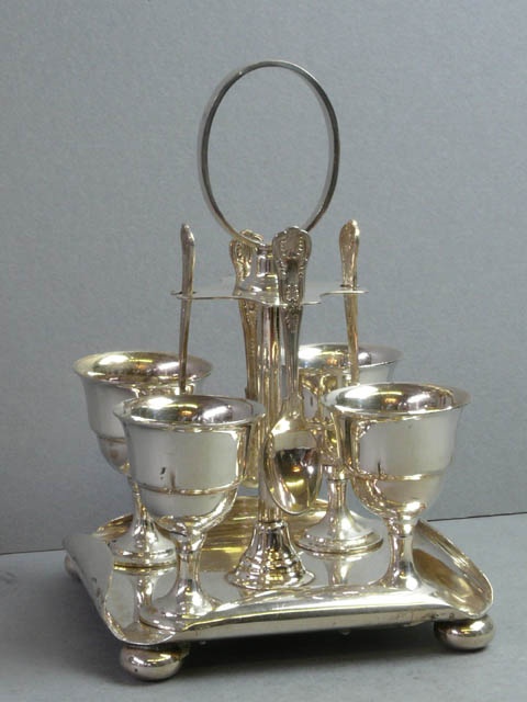 E.P. SILVER BOILED EGG STAND WITH CIRCULAR HANDLE INC. FOUR EGG CUPS AND FOUR SPOONS