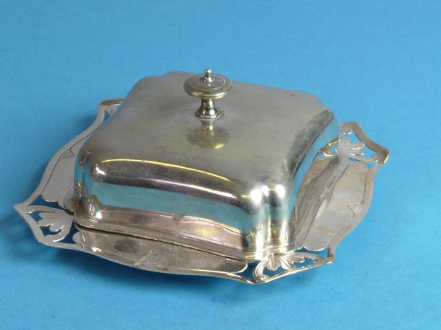 E.P. SILVER BUTTER DISH SQUARE WITH LID AND GLASS LINER