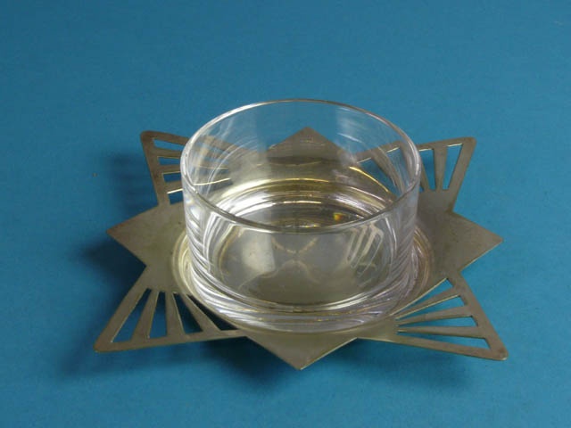 E.P. SILVER BUTTER / JAM DISH ART DECO STAR DESIGN WITH GLASS LINER