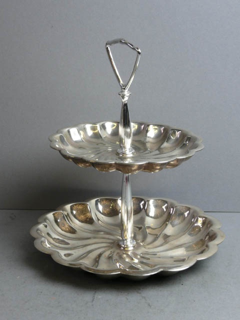 E.P. SILVER CAKE STAND TWO TIER SCOLLOP DESIGN