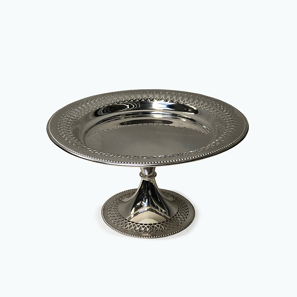 E.P. SILVER CAKE STAND WITH PIERCED FRETWORK RIM AND FOOT 13 CM HIGH 25 CM DIAM