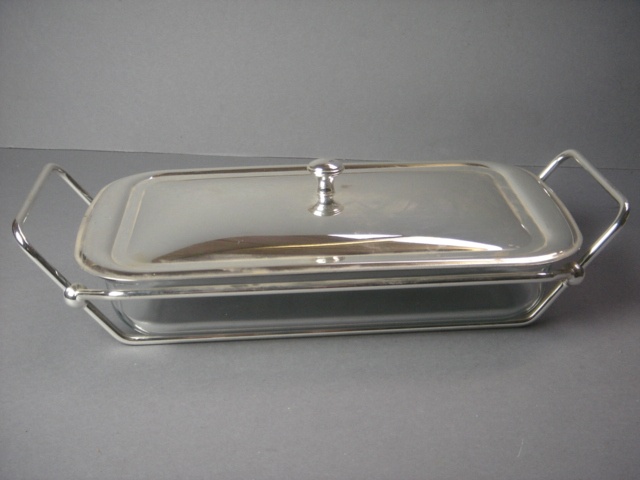 E.P. SILVER CASSEROLE DISH HOLDER MODERN WITH GLASS / PYREX LINER 31 CM