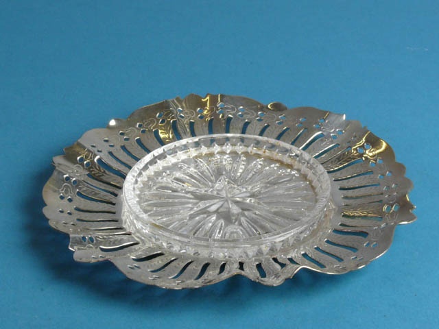 E.P. SILVER CIRCULAR BUTTER DISH ENGRAVED AND PIERCED WITH GLASS LINER