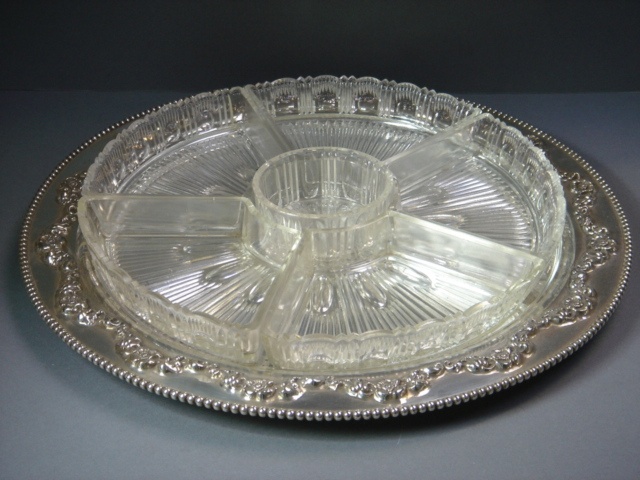 E.P. SILVER CIRCULAR HORS D'OEUVRES DISH WITH SIX GLASS LINERS 50 CM DIAM 10 CM HIGH