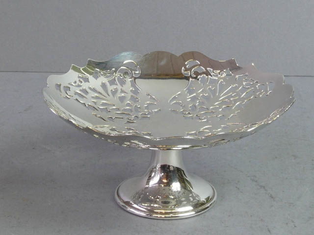 E.P. SILVER COMPORT PIERCED DISH ON FOOTED BASE 15 CM DIAM.