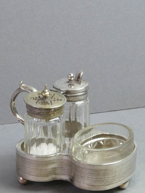 E.P. SILVER CONDIMENT SET WITH TWO CUT GLASS BOTTLES AND ONE DISH