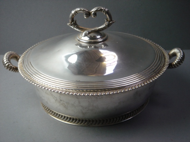 E.P. SILVER COVERED VEG DISH CHAFING PAN GADROON EDGE ON STAND WITH LID AND BURNER 24 CM