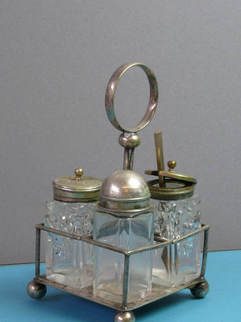 E.P. SILVER CRUET SET WITH FOUR CUT GLASS BOTTLES