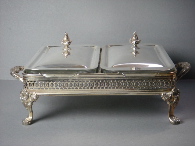 E.P. SILVER DOUBLE CASSEROLE HOLDER WITH TWO PYREX LINERS AND TWO LIDS 33 CM
