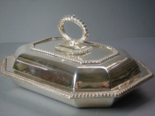 E.P. SILVER ENTREE DISH WITH LID CANTED CORNERS GADROON BORDER 29 CM