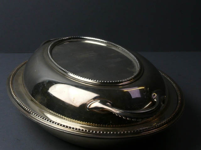 E.P. SILVER ENTREE DISH WITH LID TWIN HANDLES BEAD EDGE 29 CM