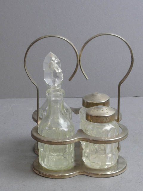 E.P. SILVER FOUR PIECE CRUET SET WITH TWO CUT GLASS BOTTLES AND SALT AND PEPPER SHAKERS