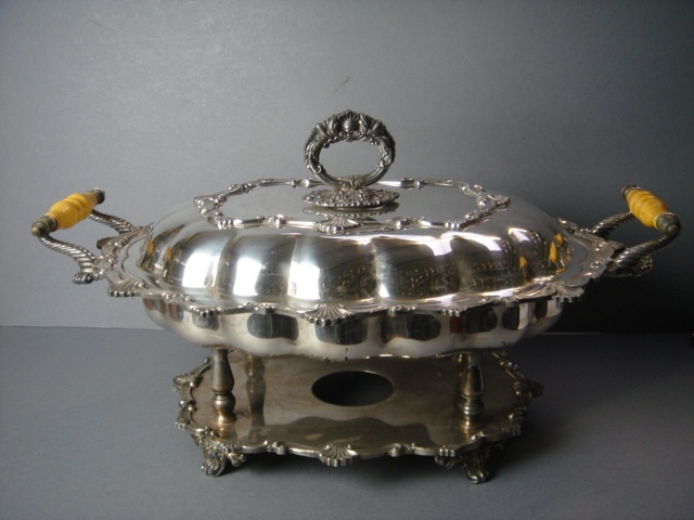 E.P. SILVER ORNATE ENTREE / CHAFING DISH AND COVER ON STAND WITH SINGLE BURNER AND TURNED BONE HANDLES 45 CM