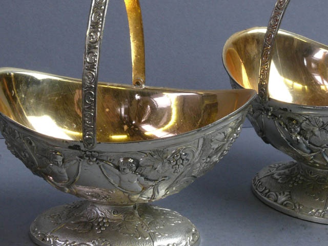 E.P. SILVER OVAL BON BON DISH WITH SILVER GILT LINING CHERUB RELIEF PAT. SWING HANDLE 16 CM (X2)