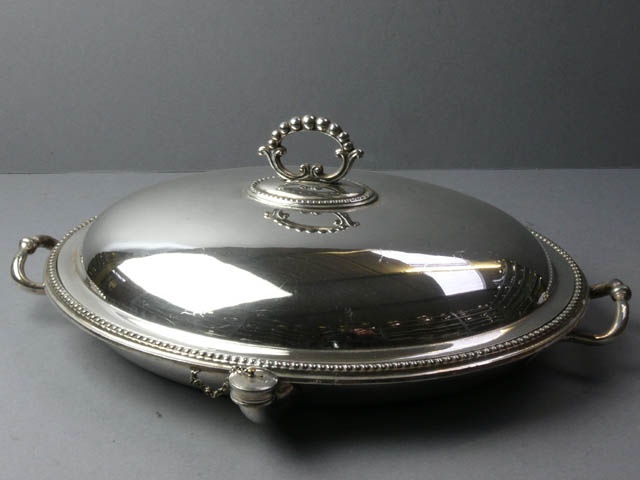 E.P. SILVER OVAL ENTREE DISH WITH LID TWIN HANDLES AND STEAM PIPE HEATED BASE BEAD EDGE 31 CM
