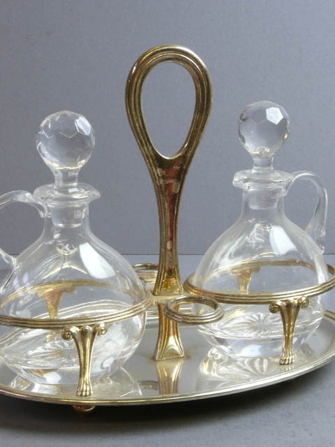 E.P. SILVER OVAL STAND WITH CRYSTAL OIL AND VINEGAR DECANTERS