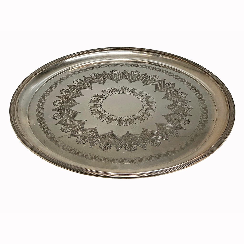E.P. SILVER PLAIN CIRCULAR GEORGIAN SALVER ON THREE CLAW FEET GADROON EDGE 30 CM DIAM