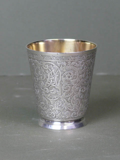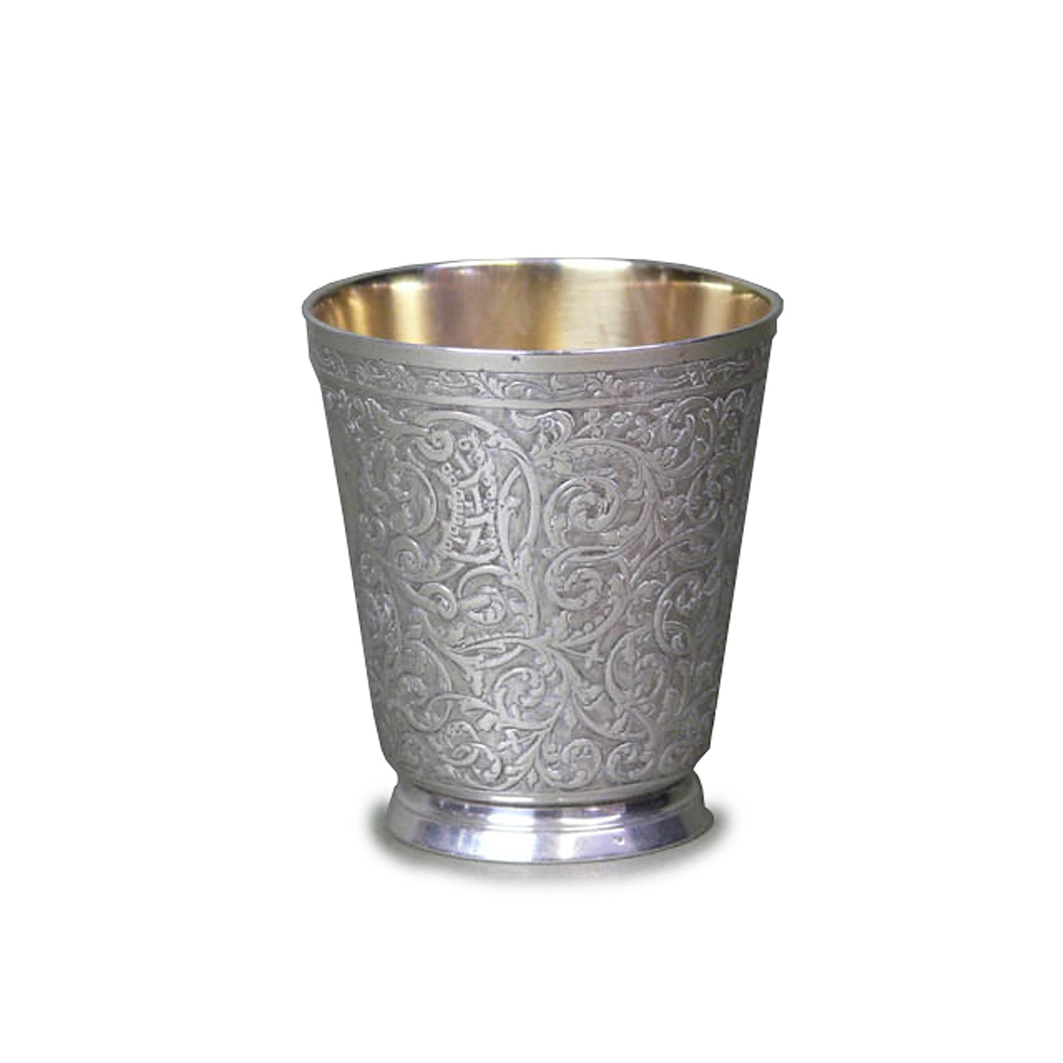E.P. SILVER SMALL ORNATE EMBOSSED BEAKER WITH GILT LINING