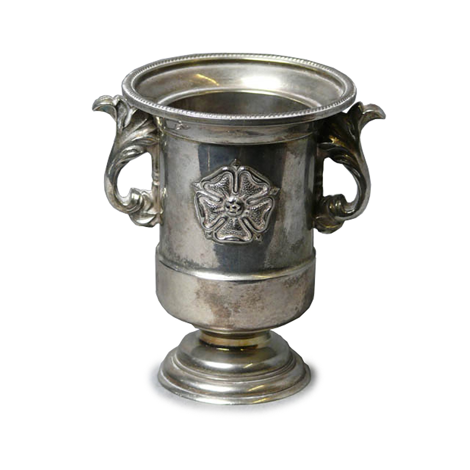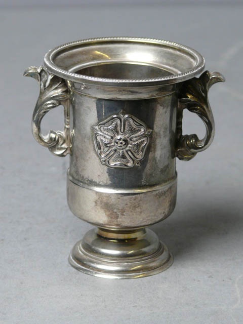 E.P. SILVER SMALL TWO HANDLED CUP WITH TUDOR ROSE