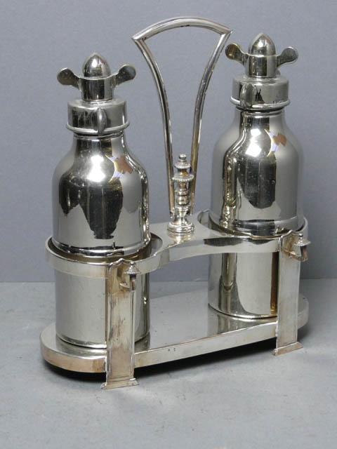 E.P. SILVER SODA BOTTLE STAND WITH TWO SODA BOTTLES