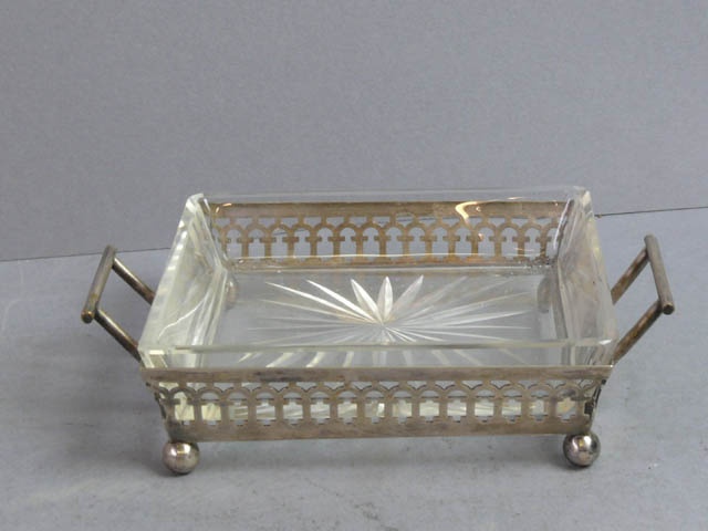 E.P. SILVER SQUARE SWEET BASKET WITH GLASS LINER AND TWIN HANDLES