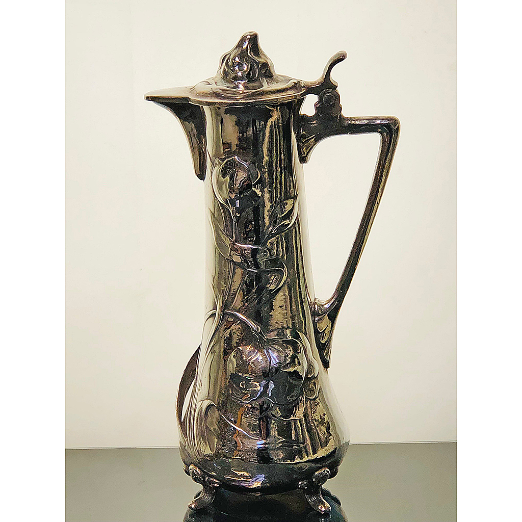 E.P. SILVER THIN ART NOUVEAU CLARET JUG ON FOUR FEET FLORAL DESIGN 32 CM HIGH