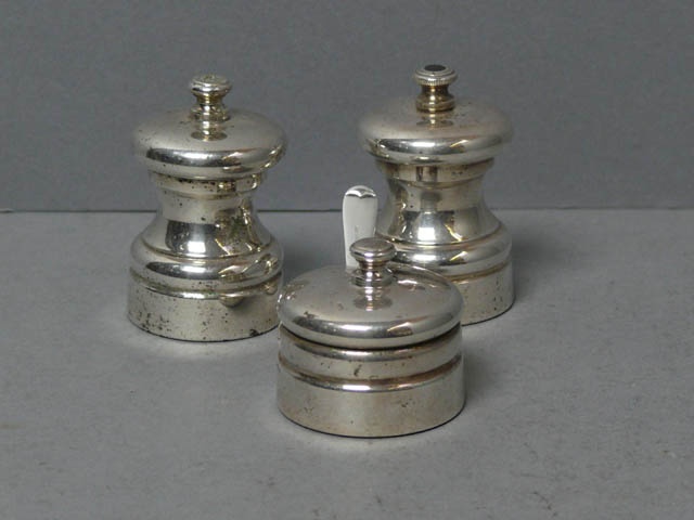 E.P. SILVER THREE PIECE MODERN CONDIMENT SET INCLUDING - SALT POT, PEPPER POT AND COVERED MUSTARD WITH SPOON