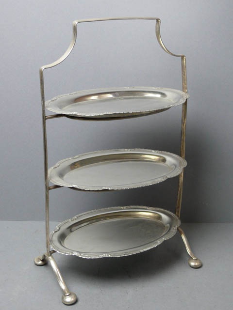 E.P SILVER THREE TIER CAKE STAND WITH FIXED OVAL ENGRAVED PLATES 43 CM HIGH