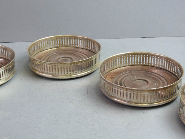 E.P. SILVER WINE COASTER PIERCED WITH MAHOGANY BASE (X4)