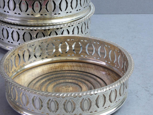 E.P. SILVER WINE COASTER PIERCED WITH MAHOGANY BASE (X4)