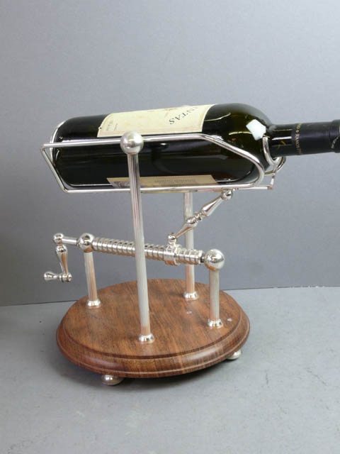 E.P. SILVER WINE CRADLE STAND ON MAHOGANY BASE WITH ADJUSTABLE HEIGHT LEVER