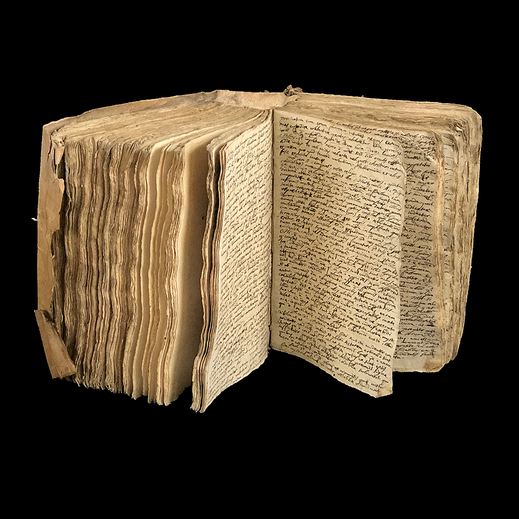EARLY 17TH CENT VELLUM BOUND BOOK WITH HAND WRITTEN LATIN TEXT AND CORD BOUND SPINE 21 CM HIGH 15 CM WIDE 14 CM DEEP