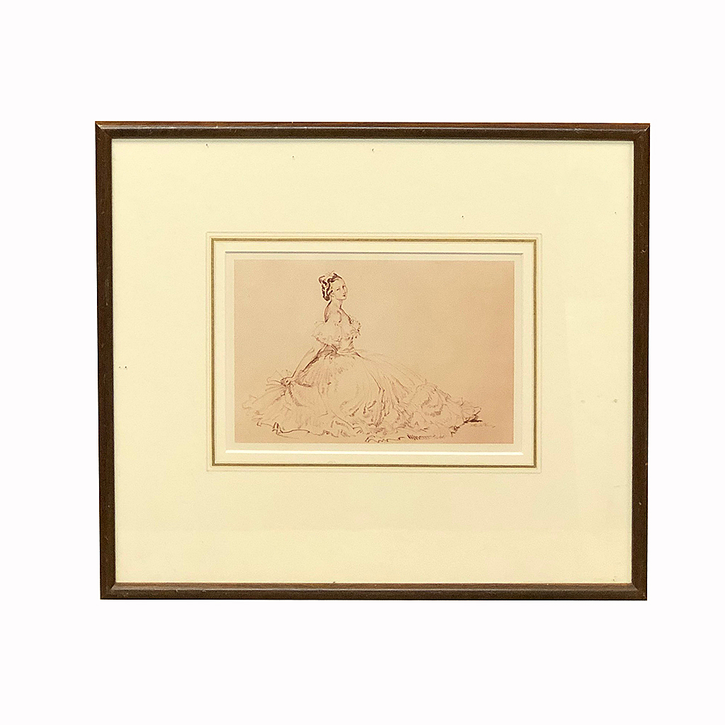 EARLY 20THC SEPIA PRINT PORTRAIT OF A LADY IN AN ELABORATE GOWN IN A PLAIN OAK FRAME WITH A LINED MOUNT 12/i X 14/i