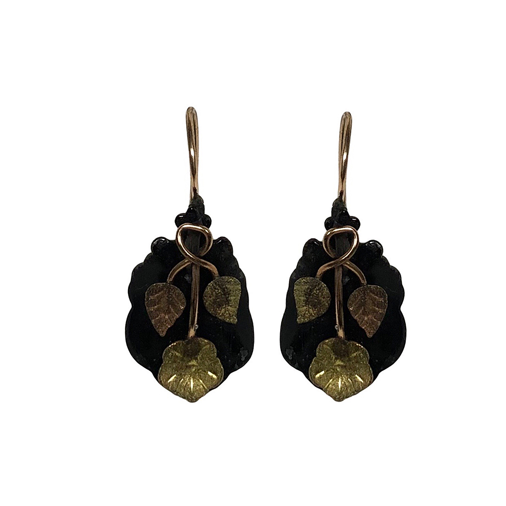 EARLY BLACK ENAMEL EARRINGS WITH FLOWER AND LEAF GOLD DECORATION (PAIR)