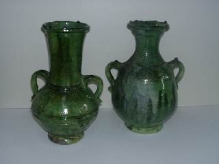 EARLY DARK GREEN GLAZED MOORISH VASE WITH LOOP HANDLES 10/i HIGH