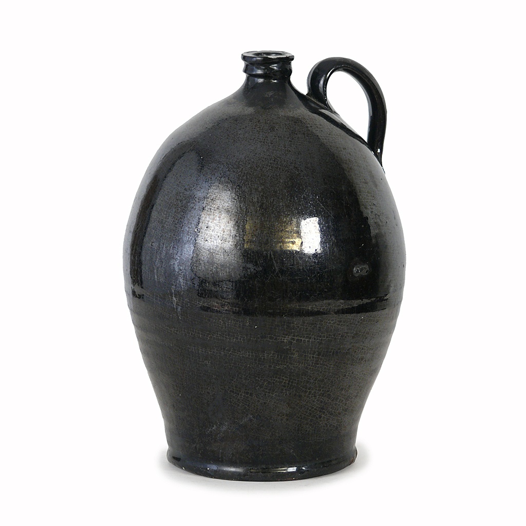EARLY ENGLISH ALE FLAGON BLACK GLAZED EARTHENWARE 33 CM HIGH