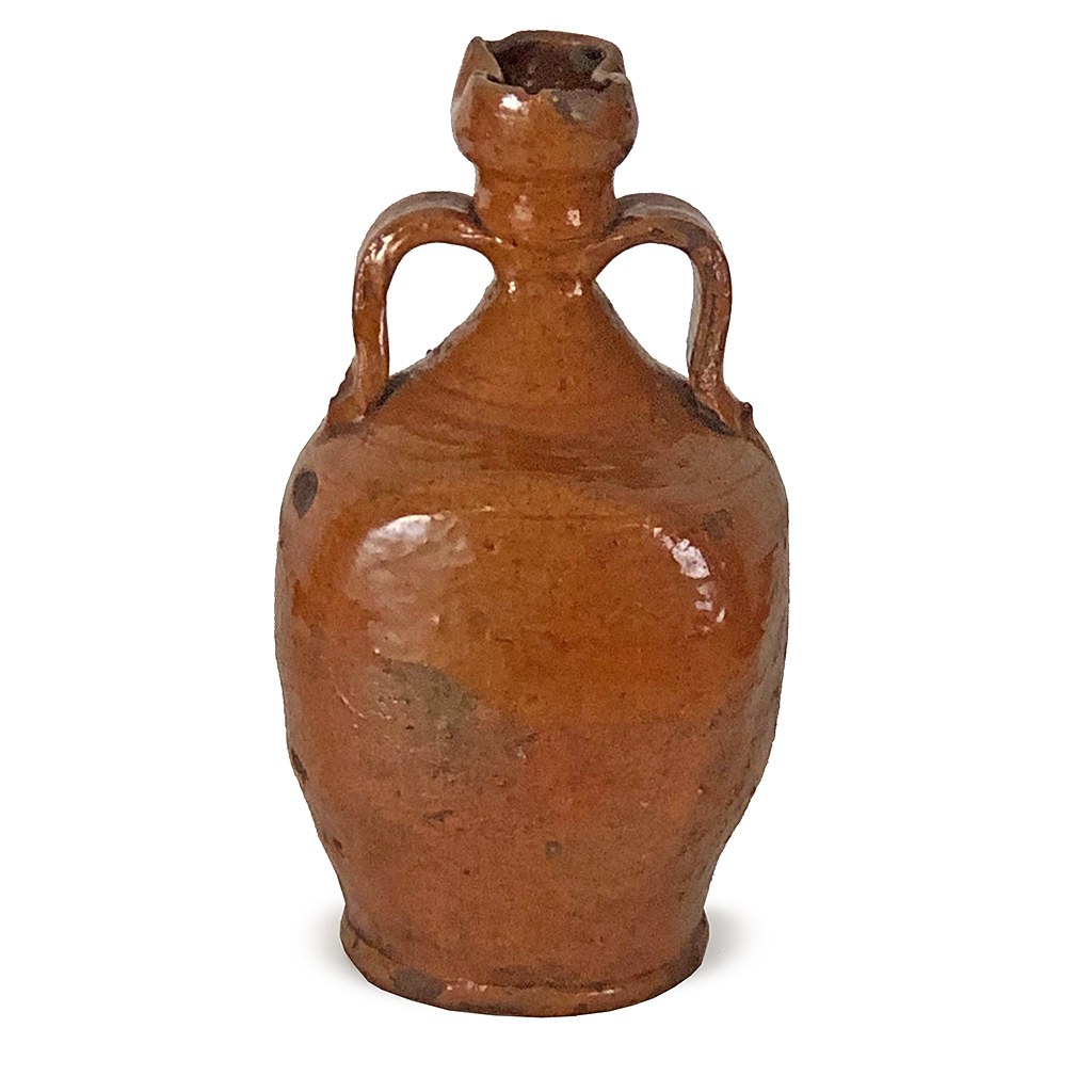 EARLY FRENCH BROWN GLAZED EARTHENWARE FLASK / FLGON WITH TWIN LOOP HANDLES EARLY 19TH CENT 24 CM HIGH