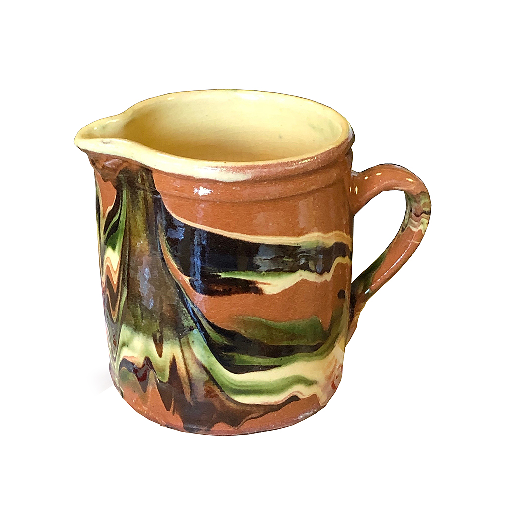 EARLY FRENCH SLIPWARE JUG BROWN AND GREEN AMBER INTERIOR 13 CM HIGH