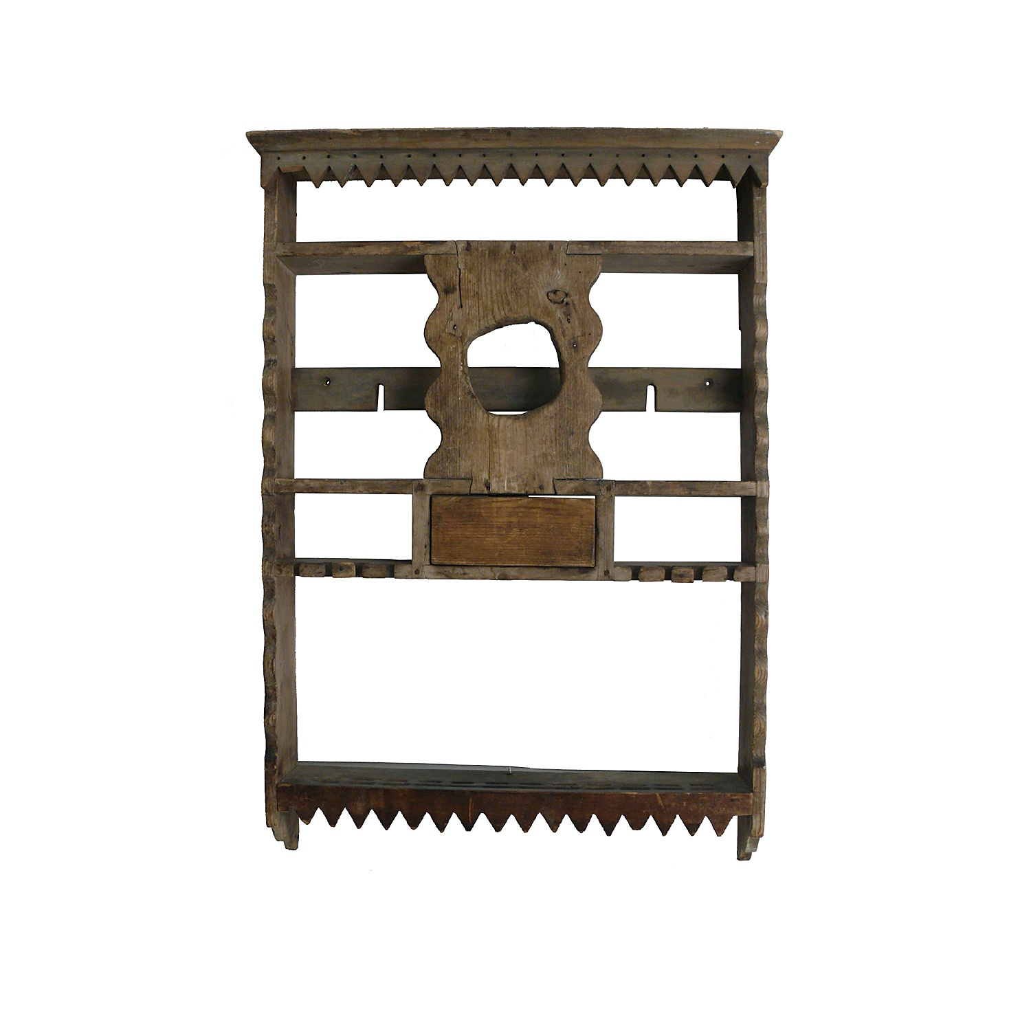EARLY SPANISH WOODEN SHELVES / PESTLE AND MORTAR RACK WITH DENTIL SHAPED TOP AND BOTTOM SHELF 81 CM HIGH 58 CM WIDE