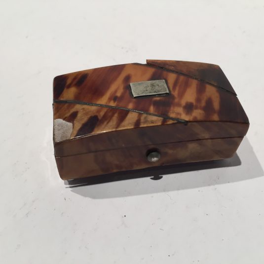 EARLY TORTOISESHELL PANELLED SNUFF / PILL BOX WITH METAL INLAY AND BUN FEET